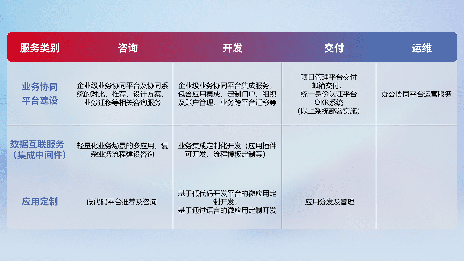 针对钉钉、、、企微、、IDaas等平台级产品提供产品的规划、、、方案、、、交付、、定制化开发等服务,,实现如统一协同办公、、智能客户服务、、混合会议管理、、、、智能数据查询、、、、等业务场景,,,,实现数字化转型。。