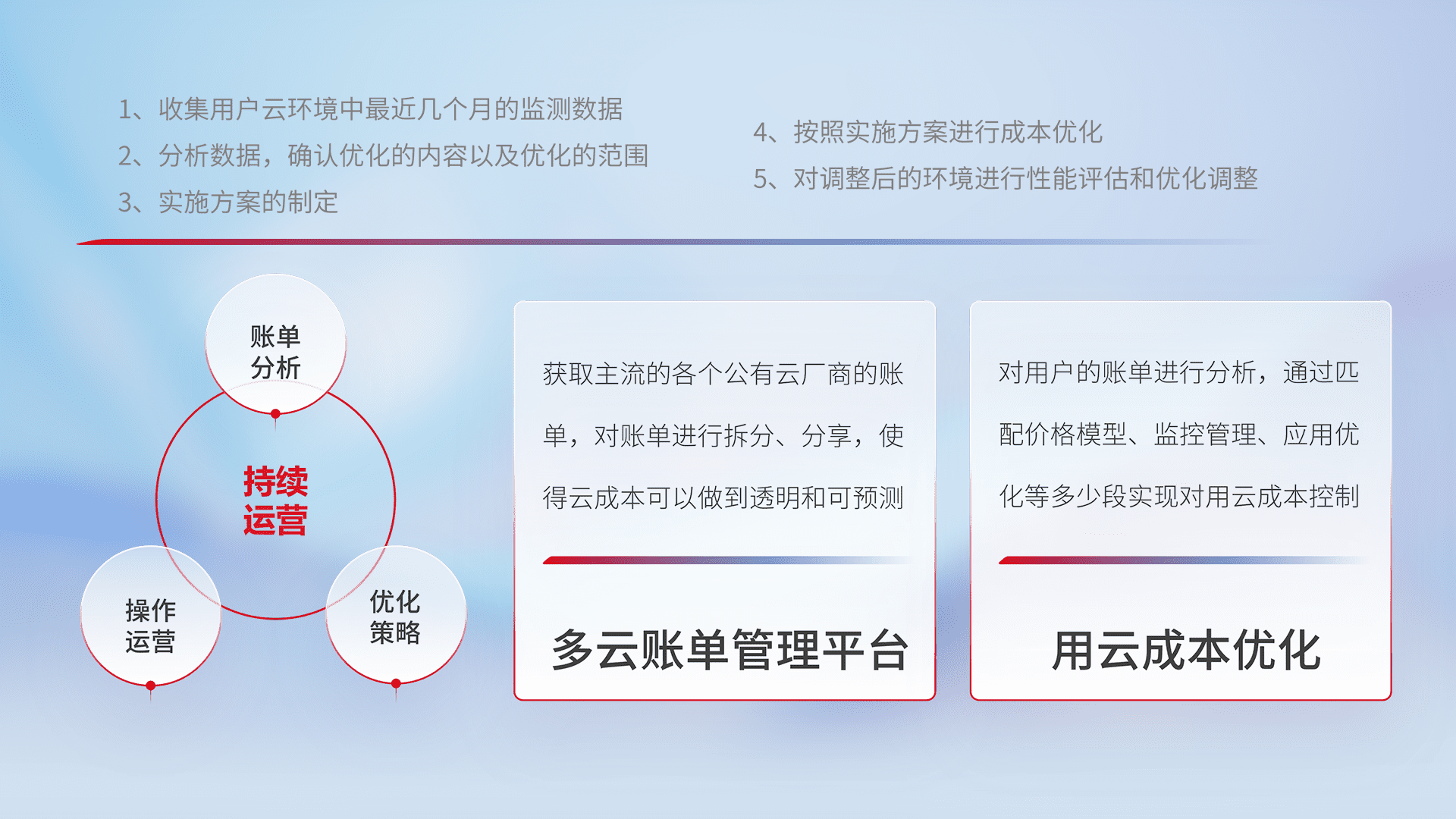 通过多云纳管,,以统一的资源数据模型把客户的云资源进行抽象和封装,,,,进而实现对多云资源的统一操作,,,保障云资源管理的可靠性、、、稳定性与可用性。。。量身定制化运维内容,,配置、、、开发运维、、补丁管理、、备份、、、监控、、、、认证和访问管理、、、审计和日常巡检等,,,保障在用云过程中的可靠度,,稳定度以及高可用率。。。。