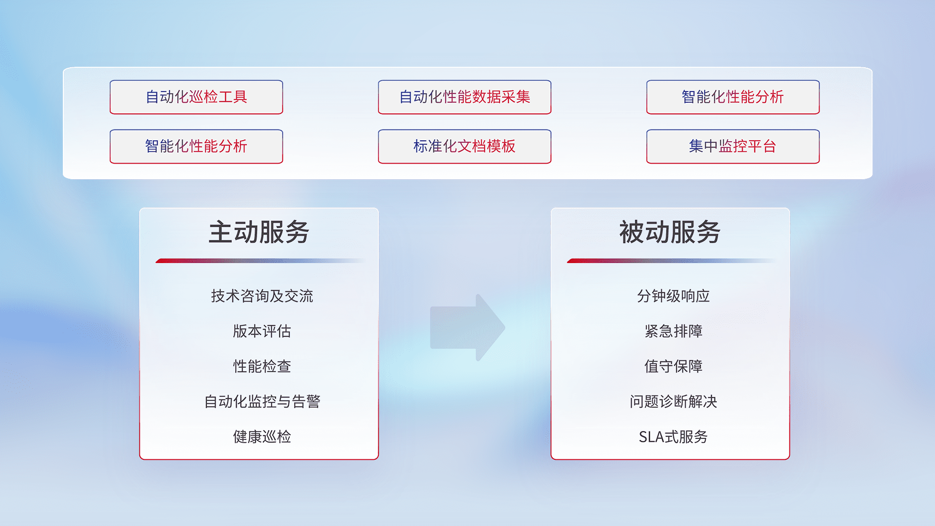 智能化工具和标准化文档,,,保障服务质量,,,,提供主动服务(包含技术咨询、、、、版本评估、、、性能检查、、、、自动化监控与告警、、、健康巡检)和被动服务包含(分钟级响应、、、、紧急排障、、、值守保障、、问题诊断解决、、SLA服务)。。。。